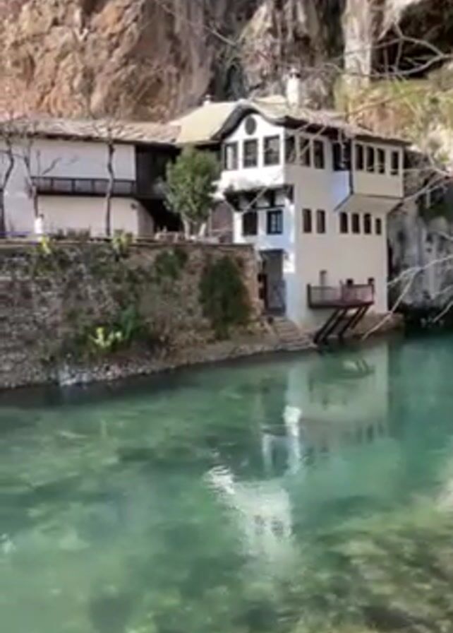 complex of buildings located next to a turquoise river and underneath a steep cliff. The camera pans from right to left, revealing a white, multi-story structure with black trim and a balcony, followed by a stone wall, and then another building constructed from brown stone. The river appears clear and shallow, with some visible rocks on the riverbed. There is light vegetation, including small trees and grass, dotting the landscape around the buildings. The overall scene suggests a historic or culturally significant site.