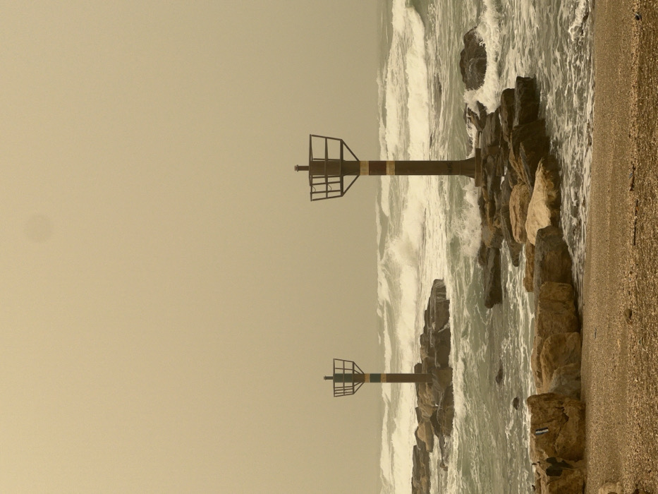 - "This image depicts a turbulent coastal scene in Jisr az-Zarqa, Israel, under an overcast, yellowish-brown sky indicative of atmospheric haze or a dust event" by FM-Bufrv1, licensed under CC BY 4.0