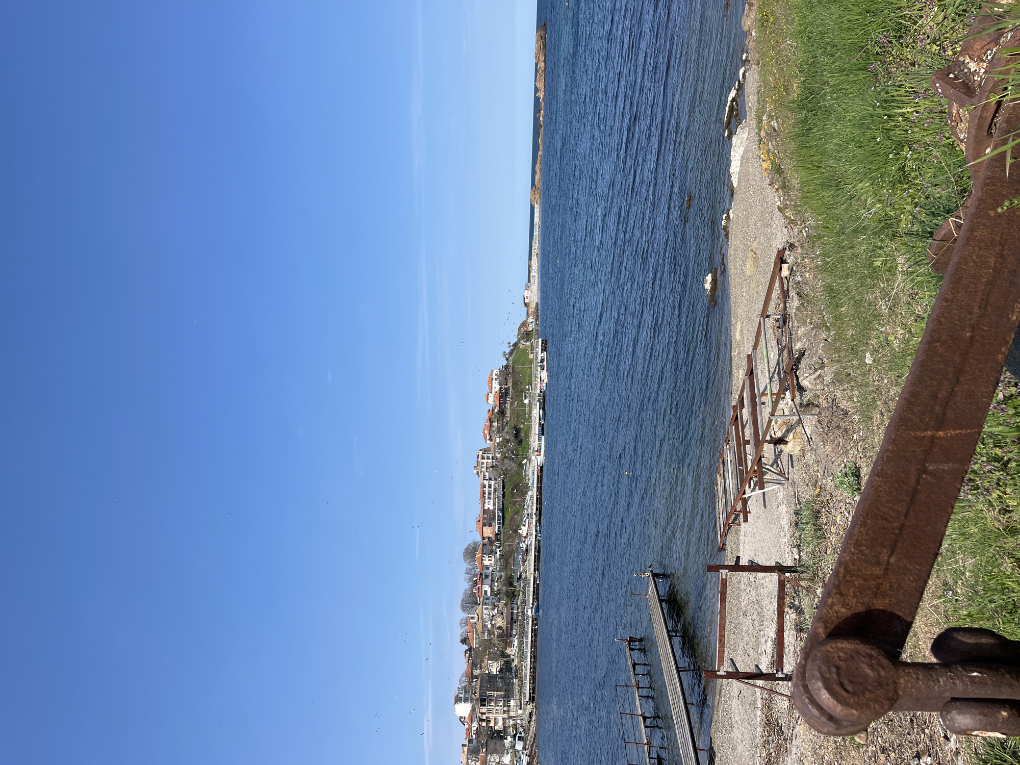 The image presents a shoreline scene in Ahtopol, Bulgaria, featuring the coast where the sea meets a line of residential buildings. A clear blue sky occupies a significant portion of the frame. The sea is visible, with ripples suggesting a mild breeze. The town's buildings, a mix of houses and structures, line the coast. A rusted metal object, potentially a remnant of a pier or harbor structure, juts into the frame, adding a sense of age and decay. Vegetation grows along the shoreline's edge. A dilapidated wooden pier and a metal frame are present near the water, reinforcing the worn and aged appearance of the coastal infrastructure.