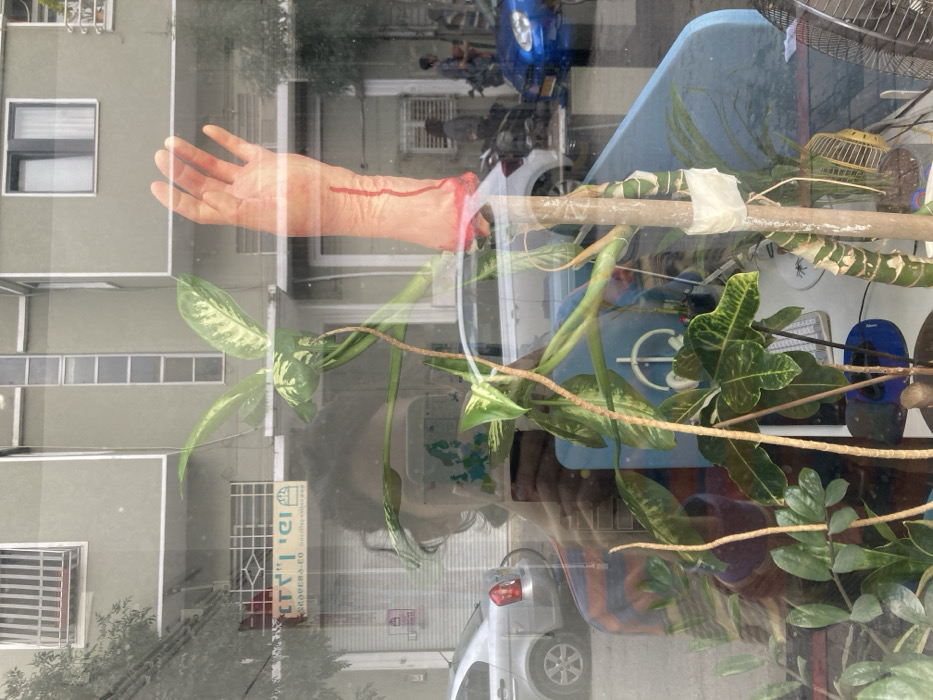The image displays a complex scene observed through a reflective glass surface, likely a storefront window, blending interior contents with exterior street elements. **Interior Scene (visible through glass and as reflection):** The foreground and midground feature multiple potted plants, including a large plant with variegated green and light green leaves prominently on the left, and other leafy green plants throughout. On the right side, an artificial human right arm, severed above the elbow, stands vertically. It is flesh-toned, exhibits a thin, reddish, linear marking resembling a blood trail or vein on its forearm, and is secured to a central vertical support with white adhesive tape. Further within the interior, segments of blue furniture or decor are visible, along with a white computer keyboard, a dark blue computer peripheral, and part of a metal-grill desk fan in the bottom right. A blue object bearing a white umbrella-like or abstract symbol is positioned behind some plants. The photographer is clearly reflected in the glass, identifiable by dark, curly hair, a striped shirt (red, blue, orange segments visible), and a smartphone held up to capture the image. **Exterior Scene (visible through glass and as reflection):** Across the street, a multi-story building with a light grey facade is visible. It features several white-framed windows, some equipped with external metal grates. A vertical strip of narrow windows runs centrally up the building's height. A sign on this building, reversed due to reflection, displays Hebrew text, including characters consistent with "מכללת טכנולוגיה" (College of Technology) and "saferna.co". The street below presents parked vehicles: a silver sedan on the left, a white small car in the center-right, and a blue car on the far right. Several indistinct human figures are discernible on the sidewalk, with at least one near a parked motorcycle. Green tree foliage is visible on both the left and right sides of the reflected street environment. **Location:** The presence of Hebrew script on the reflected street sign directly across from the viewpoint confirms the location as the city of Tel Aviv, Israel.