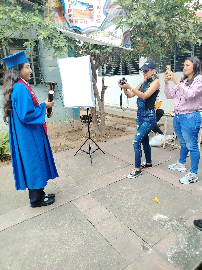 The scene depicts an outdoor graduation photo shoot taking place in Las Tejerías, Venezuela, likely within an educational institution's courtyard
