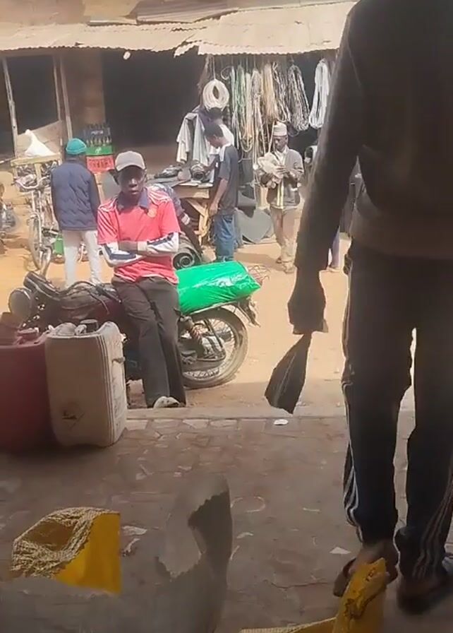 street scene in a market or commercial area with several people walking around and a man sitting on a motorcycle. The man on the motorcycle is wearing a red shirt with a logo and a white cap. He has his arms crossed and appears to be waiting. The motorcycle has a green bag attached to the back. Behind the motorcycle, there are some large containers and a white box. Several people are visible in the background, some are carrying items like a pipe, others are standing around the shops. The buildings appear to be small shops with corrugated iron roofs. There are items hanging on display in front of the shops, including ropes and electrical wires. In the foreground, there are some sacks, partially visible, with yellow material. The overall environment suggests a busy and somewhat cluttered outdoor market setting.