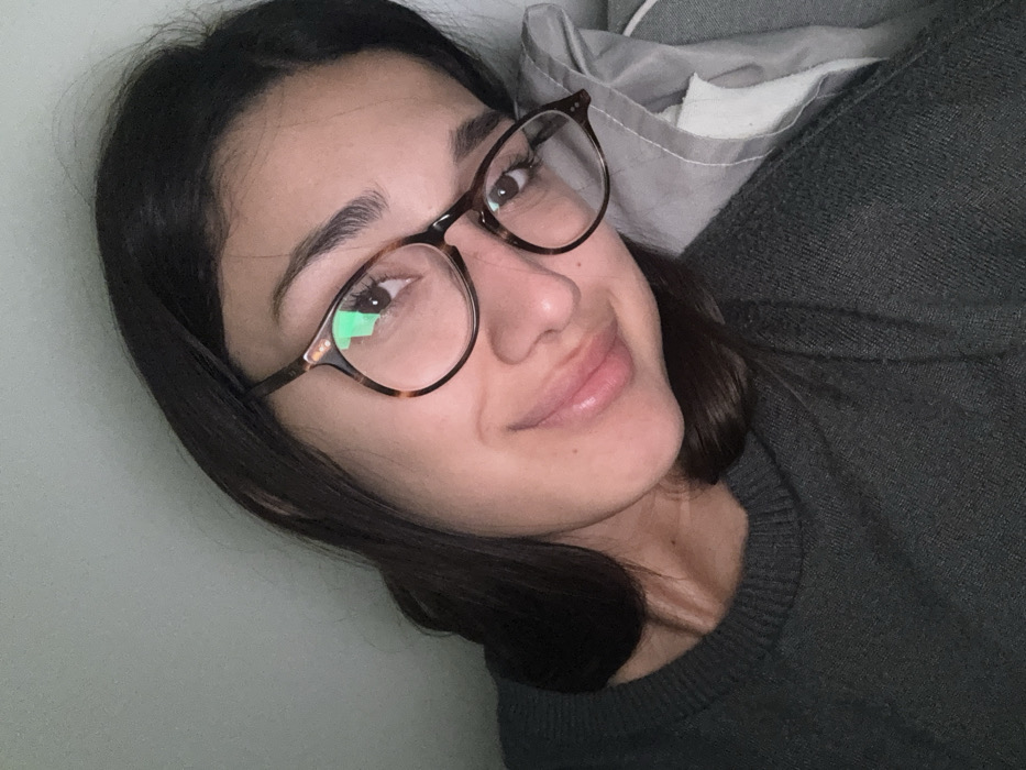 A young woman with dark hair and wearing tortoiseshell glasses is angled towards the camera. She is lying down and appears to be on a bed, with the edge of a pillow visible behind her head and a dark gray sweater visible around her neck. Her expression is relaxed, and she appears to be smiling slightly. There is a faint green reflection visible on the lens of one of her glasses. The overall lighting is muted, giving the image a soft, intimate feel.