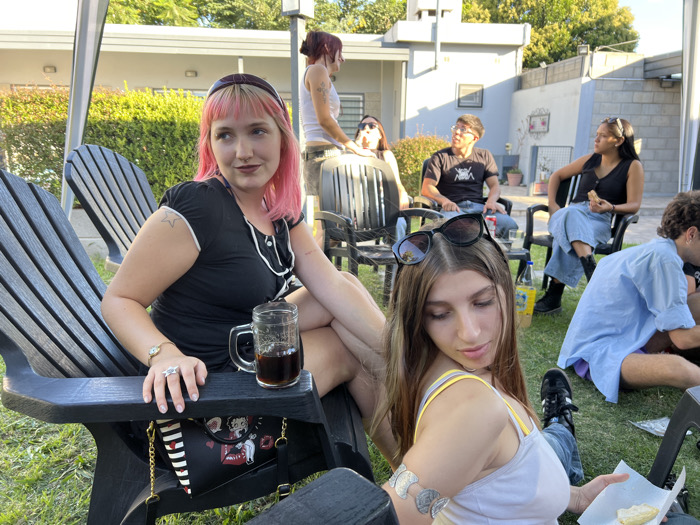 The image depicts an outdoor social gathering of seven young adults in a residential backyard in Quilmes Oeste, Argentina. The scene is illuminated by natural daylight, indicating daytime. In the immediate foreground, on the left, a female with light pink and blonde hair, styled with bangs and a dark brown headband, is seated in a black Adirondack-style chair. She wears a black short-sleeved top with white trim and buttons, dark lipstick, a ring on her left ring finger, and a star tattoo on her right bicep. Her gaze is directed towards the right side of the frame. A clear glass mug containing a dark brown liquid rests on the chair's armrest beside her. A black handbag, decorated with white stripes and a Betty Boop illustration, hangs from the armrest. To the right, a second female with long brown hair, wearing sunglasses on her head and a white and yellow tank top, is seated on the grass or a low surface. She wears a silver arm cuff on her left bicep and holds a piece of white food in her left hand, looking downwards. Her lower body is visible, showing light blue jeans and black sneakers. In the mid-ground, a third female with reddish-brown hair and a light-colored tank top is standing behind the pink-haired woman. Further back, a fourth female with dark hair and sunglasses perched on her head is seated in a black patio chair. Adjacent to her, a male with short dark hair is seated in a black patio chair, wearing a black t-shirt with a white graphic design and blue jeans; he is looking upwards and to the right. Next to him, a fifth female with dark hair and a white headband is seated in a black patio chair, wearing a black sleeveless top, light blue wide-leg jeans, and black boots. She holds a piece of food in her hands. On the far right, a sixth male with light-colored, possibly curly hair is seated on the grass, partially facing away from the viewer, wearing a light blue long-sleeved shirt and dark shorts. The background features a low, light-colored residential building with a flat roof, green hedges, and a concrete perimeter wall. A plastic bottle with a yellow label is visible on a small table situated among the mid-ground group. The ground throughout the visible area is covered in green grass.