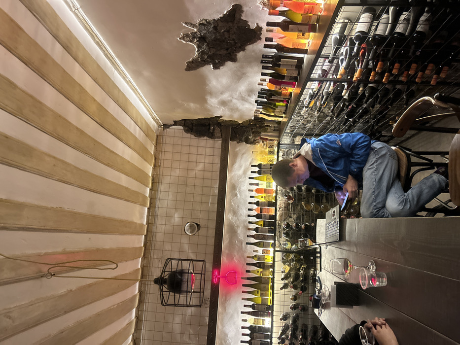 An angled view captures a person in a blue jacket and jeans seated at a dark wooden bar, using a laptop and phone. Wine bottles line the shelves behind them, stretching upwards towards a textured, cloud-like ceiling. A cage light fixture hangs from a white, striped wall, accented by a neon wine glass. The scene is illuminated, showcasing a mix of architectural details and contemporary activity.