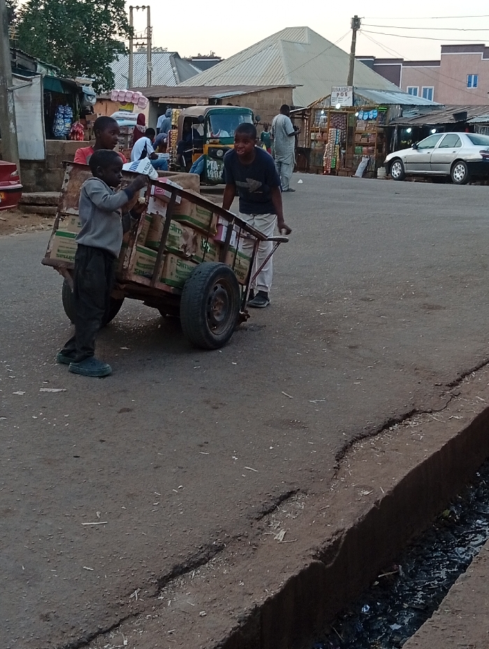 - "Three young boys pull a heavily-loaded cart along a cracked street in what appears to be an impoverished area" by FM-Ha99I2, licensed under CC BY 4.0