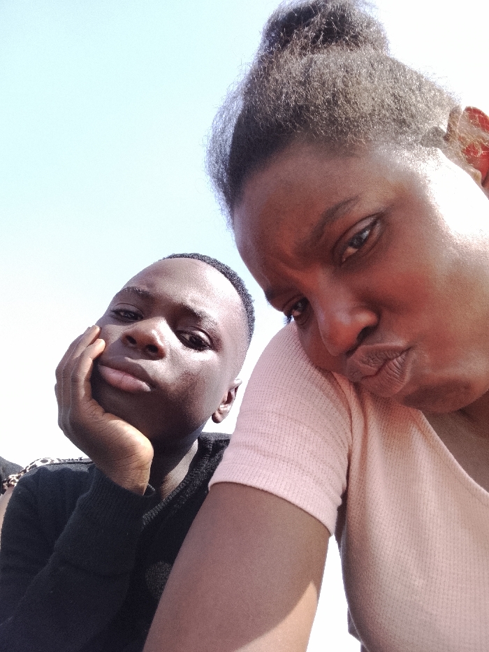 This image, taken in Ibi, Nigeria, features two individuals outdoors under a clear, light blue sky. An adult female is positioned on the right, capturing the image, identifiable by her dark hair tied up and a light pink, short-sleeved, textured top. Her facial expression shows pursed lips in a pout. Adjacent to her on the left is a younger individual, appearing male, with short dark hair. He wears a dark, long-sleeved top and rests his left hand against his chin, presenting a contemplative gaze towards the camera. The foreground shows parts of their upper bodies, while the background consists solely of the unobstructed sky.