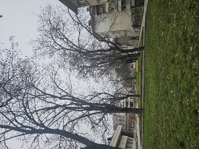 The image displays an urban green space or park in Pleven, Bulgaria, under an overcast sky