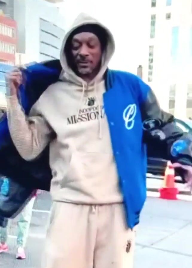 man, possibly a celebrity, wearing a light-colored hooded sweatshirt, khaki pants, and a blue and black varsity jacket. He is standing outside near a black van and a red traffic cone, and he seems to be adjusting his jacket. Another man in a black jacket and cap walks past him, smiling. In the background, there are other people, a building, and a street. The person filming is moving slightly.