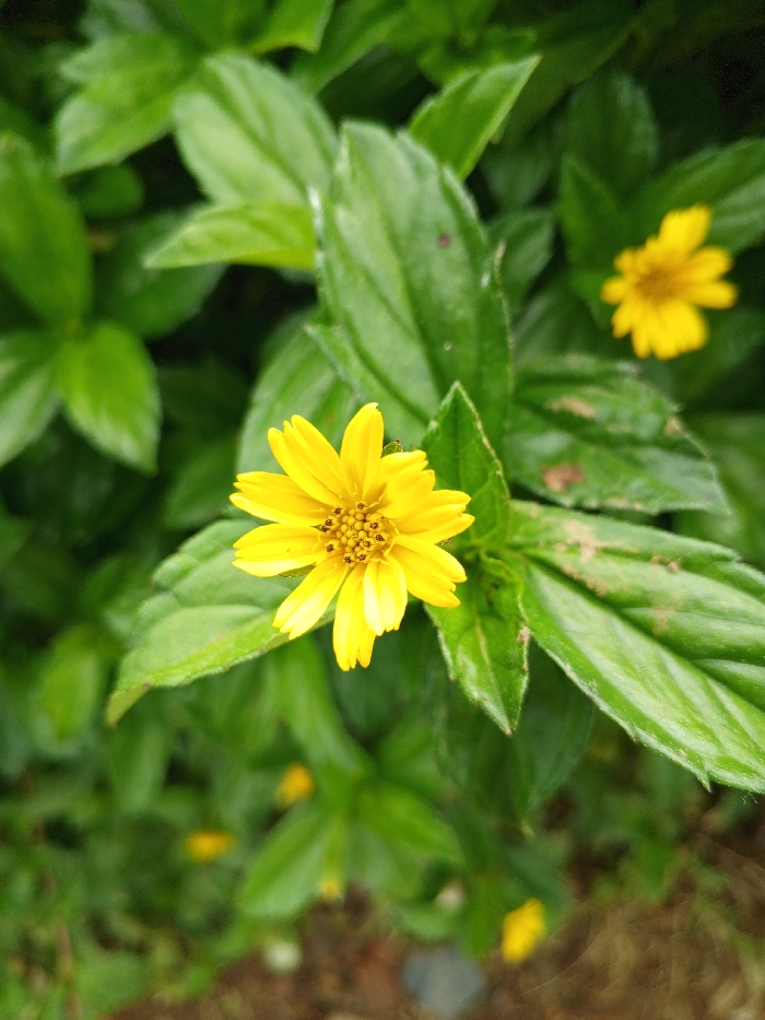 A vibrant yellow flower takes center stage, its numerous petals surrounding a dark brown center. The flower is surrounded by lush green leaves, some with small dark spots. Another yellow flower is partially visible in the background. The overall impression is one of natural beauty and freshness, with a focus on the striking contrast between the bright yellow petals and the green foliage.
