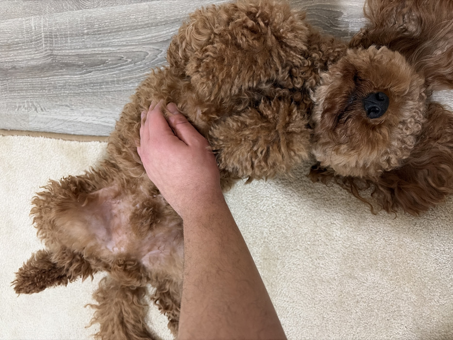 - "An indoor scene in Rostov-on-Don, Russia, depicts a brown, curly-haired dog, identified as a poodle-type breed, lying supine" by FM-FZBdJ2, licensed under CC BY 4.0