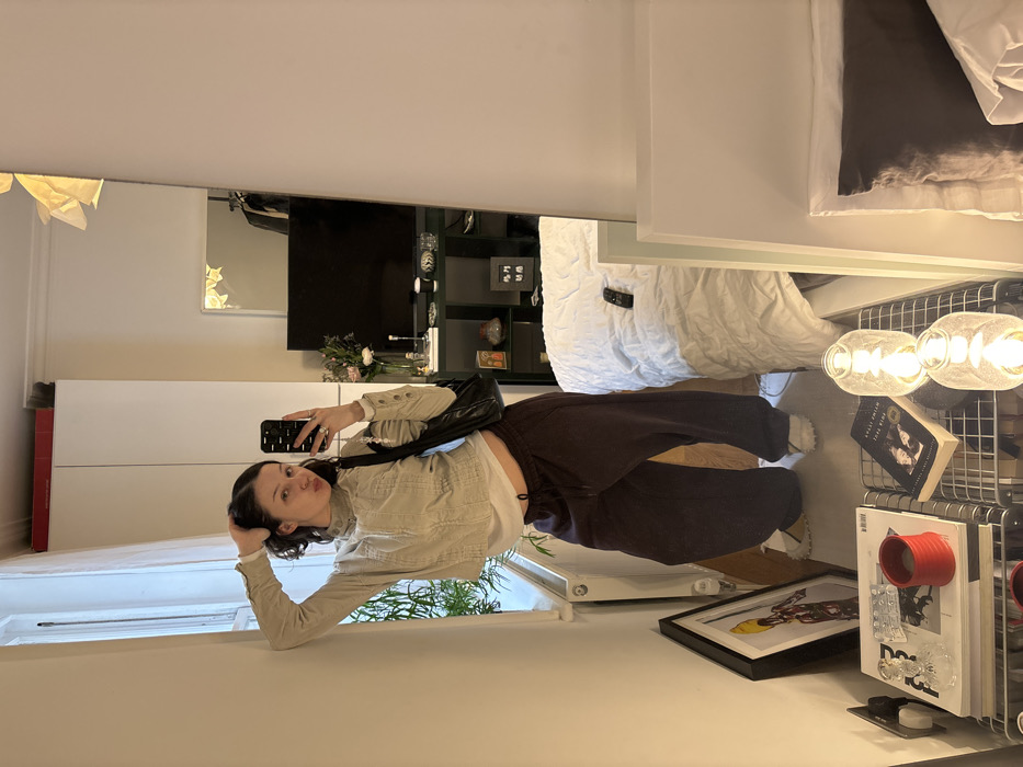 This image depicts a female subject in a residential apartment in the City of London, United Kingdom, captured via a mirror reflection. The subject, appearing to be in her mid-20s with dark hair, stands facing a large mirror, holding a black smartphone with a textured case to take a selfie. She wears a light beige long-sleeved jacket over a white midriff-baring top, dark brown drawstring sweatpants, and light-colored footwear. A black shoulder bag hangs from her left shoulder. Her left hand rests on her head, and her facial expression is a slight pout directed towards the phone camera. A light-colored, beaded phone charm extends from her phone. The reflected interior environment suggests a bedroom or studio apartment. To the subject's left, a white wall contains a white radiator situated beneath a window, which is covered by white curtains or blinds, revealing a green plant. A framed artwork, featuring yellow and dark tones, leans against the wall on the floor. In the foreground, a two-tiered metal shelving unit holds stacked papers or magazines, a blister pack of pills, a red cylindrical object, a clear glass dish, and two books, one identifiable as "Dwell Time" by Jonathan P. Watts. Two illuminated glass light fixtures with visible filaments are present on this shelf. To the subject's right, a bed with a white textured duvet and a dark pillow is visible, with a black remote control resting on the duvet. The background of the reflection reveals white wardrobe units, a dark shelf unit supporting a television, a vase with pink and white flowers, various decorative glass items, a small framed picture, and an ornament with Chinese characters. A smaller decorative mirror hangs above the television. The ceiling features a white, paper-like light fixture. The room's lighting is a combination of natural light from the window and warm artificial illumination from multiple fixtures.