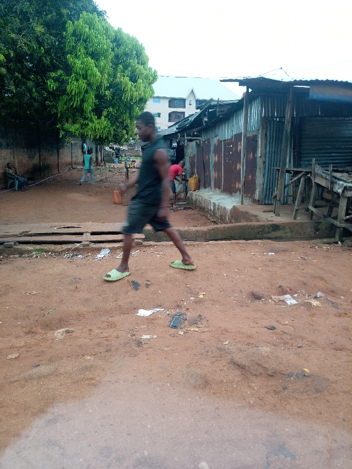 A man in a dark tank top, shorts, and light-colored slides walks on a reddish-brown dirt road scattered with debris. Beside the road is a corrugated metal structure with a rickety wooden frame. In the background, a building with multiple stories can be seen. A tree with dense green foliage sits to the left of the road. Other people are present, one sitting on a chair, and another wearing a red shirt.