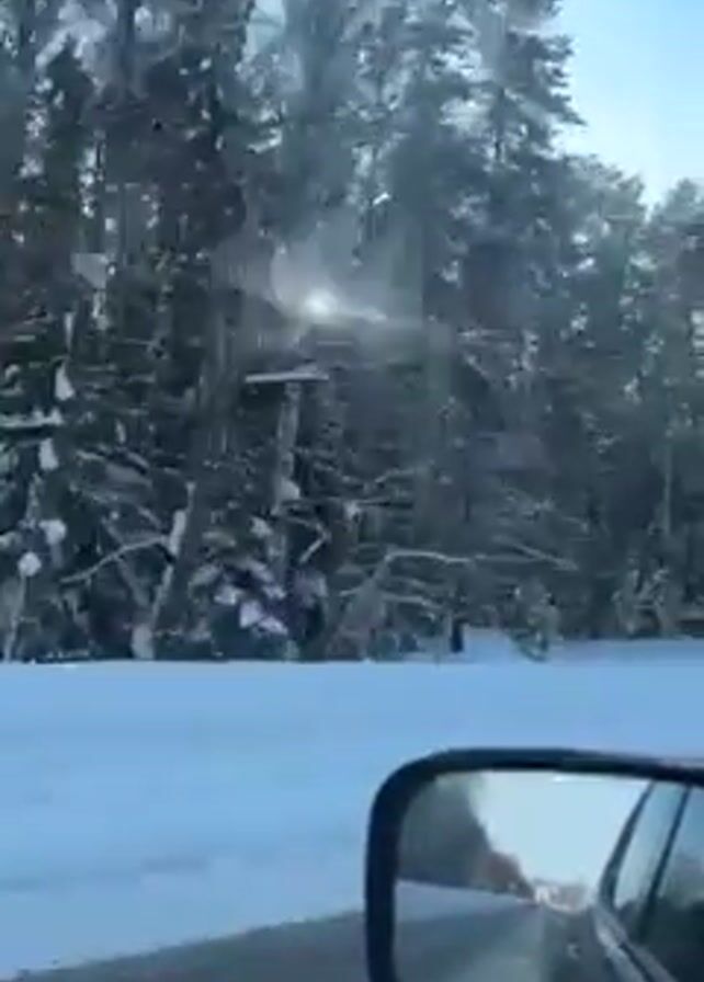 car driving on a road in winter. The road is covered in snow, as are the trees lining the roadside. The sun is shining through the trees. The rearview mirror of the car is visible in the lower right corner of the frame. Music is playing.