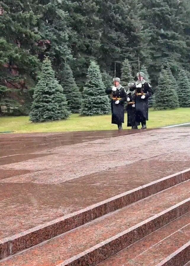 Three guards are performing a ceremonial walk in the snow. They are wearing dark blue uniforms and tall gray hats. They carry long rifles with bayonets. They march along a wet, red granite path lined with small evergreen trees. Snow is falling steadily. A set of wide red granite steps is in the foreground.