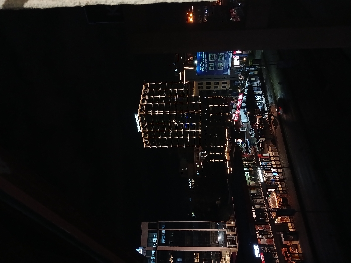 The image, taken at night, shows a view of a cityscape from a high-rise building