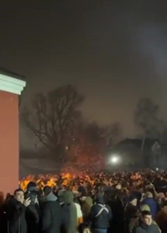 The video depicts a large crowd of people gathered outdoors at night. A bonfire is visible in the middle of the crowd, with sparks rising into the air. Many people are holding up their phones to record the scene. The background includes trees and buildings. There is a light source that creates a beam pointing up into the sky. The sky is dark and cloudy.