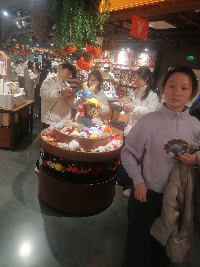 The scene depicts the interior of a brightly lit retail establishment, likely a gift or specialty store, located in Dongcheng District, China. The environment features a dark tiled floor and a ceiling adorned with extensive artificial green foliage and several large, spherical orange decorations. A red square sign bearing the Chinese Yuan symbol (¥) hangs overhead. In the mid-ground, a prominent two-tiered circular wooden display stand occupies the center. The top tier is filled with numerous small, colorful plush toys, some appearing as pom-poms or stylized animals. A larger, light blue plush figure resembling an animal wearing a pointed hat and holding a small woven basket filled with colorful, rounded objects (possibly toy ice cream scoops) is centrally positioned on this tier. The lower tier of the display holds an array of smaller, darker plush items or keychains, each with an attached tag. Several individuals are present. In the immediate foreground on the right, a young woman with glasses, wearing a light purple quarter-zip sweatshirt and dark pants, stands holding a gray puffer jacket over her left arm and a small, circular, red-and-green decorative object in her right hand. She gazes directly forward. Behind her, other patrons browse the merchandise. To the left of the central display, a young man with glasses, dressed in a white jacket, is shown looking down at his hands, possibly interacting with a small item. Adjacent to him, another young woman with glasses, also in a white jacket, appears to be examining the plush figure on the display stand. Additional individuals are visible in the background, browsing shelves stocked with various packaged goods and products, indicating active shopping activity within the store.