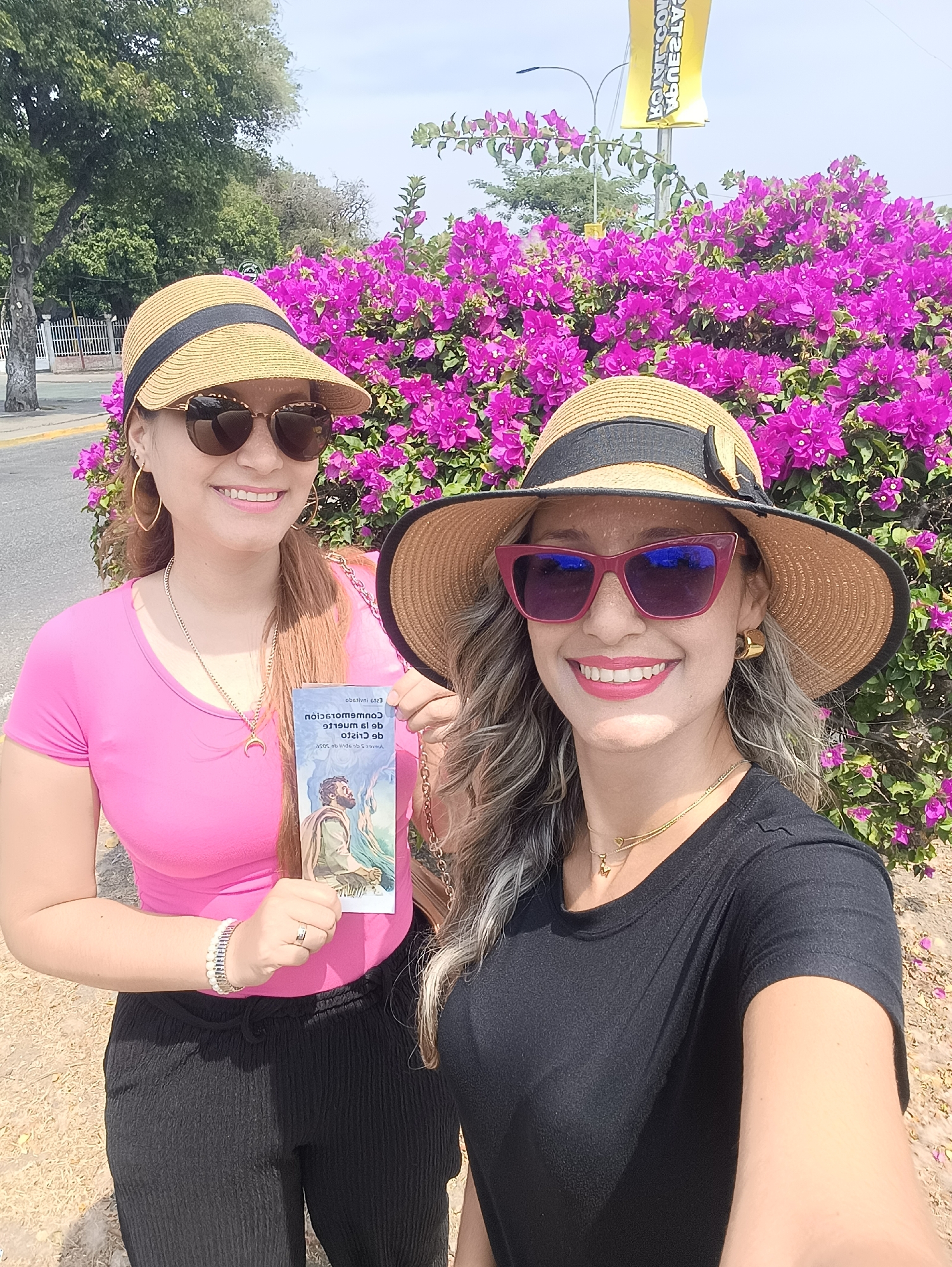 Two adult females are depicted outdoors under a clear blue sky in what is identified as La Victoria, Venezuela. Both individuals are smiling directly at the camera. The female on the left wears a pink short-sleeved top, black pleated pants, a tan straw visor with a black band, and dark sunglasses with brown frames. She accessorizes with gold hoop earrings, a long gold necklace featuring a crescent moon pendant, a silver bracelet on her left wrist, and a ring on her left ring finger. In her right hand, she holds a small, vertically oriented, light-colored booklet. The booklet displays an image of a bearded man in ancient attire and Spanish text, partially legible as "Conmemoración" and "muerte de Jesucristo". The female on the right wears a black short-sleeved top, a wide-brimmed tan straw hat with a black band, and red-framed sunglasses. She wears gold earrings and two gold necklaces, one with a small 'M' pendant. Her right arm is extended, suggesting she is holding the camera for a selfie-style photograph. Both women are positioned in front of a large, dense bush featuring vibrant magenta bougainvillea flowers. In the background to the left, a paved road or sidewalk with a yellow painted curb is visible, along with a white metal fence and green trees. To the right, behind the flowering bush, a utility pole stands, from which a vertical yellow banner with black text is hanging. Partial text on the banner is discernible as "CONMEMORACIÓN DE LA MUERTE". The ground in the immediate foreground consists of dry, light-colored soil with scattered flower petals. The scene is illuminated by bright sunlight.
