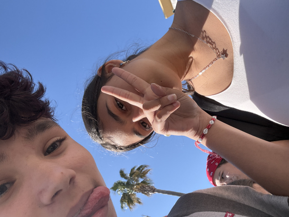 A low-angle, outdoor photograph taken in Quarteira, Portugal, under a clear blue sky. Three individuals are depicted. In the foreground, on the left, a subject with dark, curly hair extends their tongue. On the right, a female subject with dark hair wears a white top, a silver chain necklace with a star pendant, and a red and white beaded bracelet on her right wrist, while displaying a V-sign with her right hand. A small earring is visible in her right ear. A third individual, female, is partially visible in the mid-ground, wearing a red patterned bandana. The background includes a tall palm tree and a section of a light-colored building facade. The scene is illuminated by bright natural sunlight.