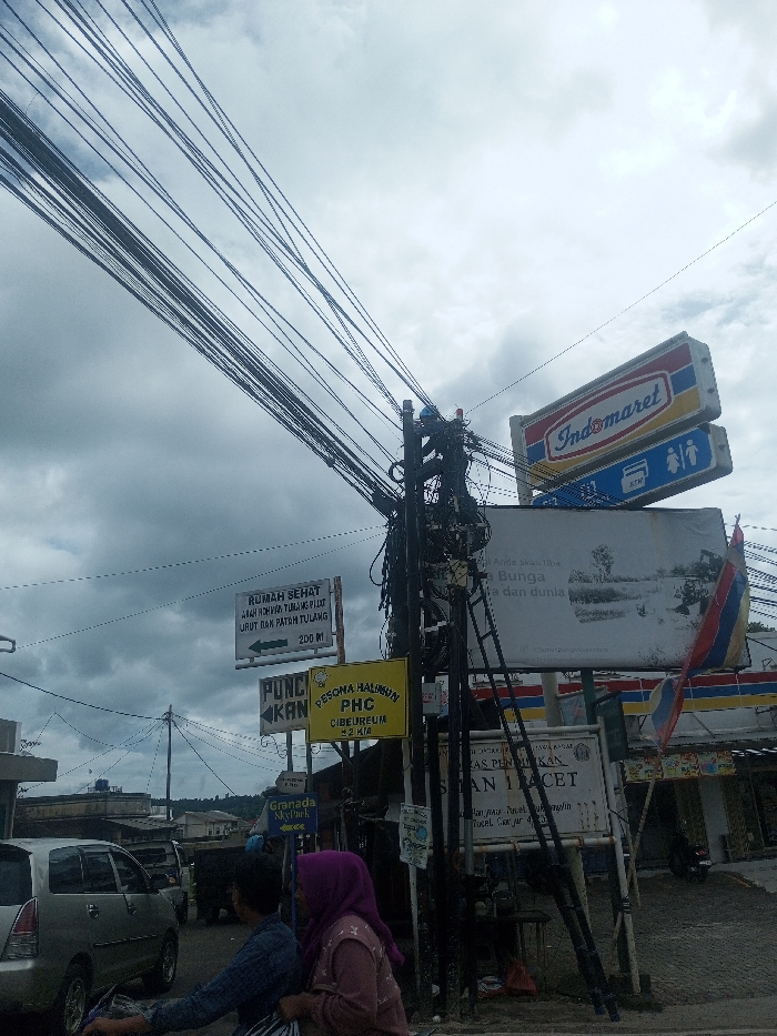 The image presents a street scene in Sukanagalih, Indonesia, under a cloudy sky. A densely wired utility pole dominates the central frame, supporting numerous black electrical and communication cables that extend diagonally upwards to the left. A black multi-section ladder leans against the right side of this pole. To the pole's right, an "Indomaret" sign is prominently displayed above a sign indicating ATM and restroom facilities. A large billboard, partially obscured by the pole, features a landscape image and some text. A red and blue striped flag is affixed near an Indomaret store entrance, visible on the far right. To the pole's left, a white directional sign points left, stating "RUMAH SEHAT Ahli Hancur Tulang & Patah Tulang 200 M." Below it, a yellow sign reads "PESONA HALIMUN PHC CIBEREUM 2 KM." A partially visible white sign labeled "PUNCAK KAN" is further to the left, with a "Granada SkyPark" sign below it. Near the base of the ladder, a white sign for "DINAS PENDIDIKAN SMAN 1 PACET" is visible. In the lower foreground, two individuals are riding a motorcycle, moving from left to right. The person in front wears a dark blue long-sleeved shirt. The passenger behind wears a purple hijab and a light brown top. Their faces are largely obscured. Behind them, a silver minivan, likely a Toyota Innova, is partially visible, moving in the opposite direction. Additional buildings and vehicles are present in the background.