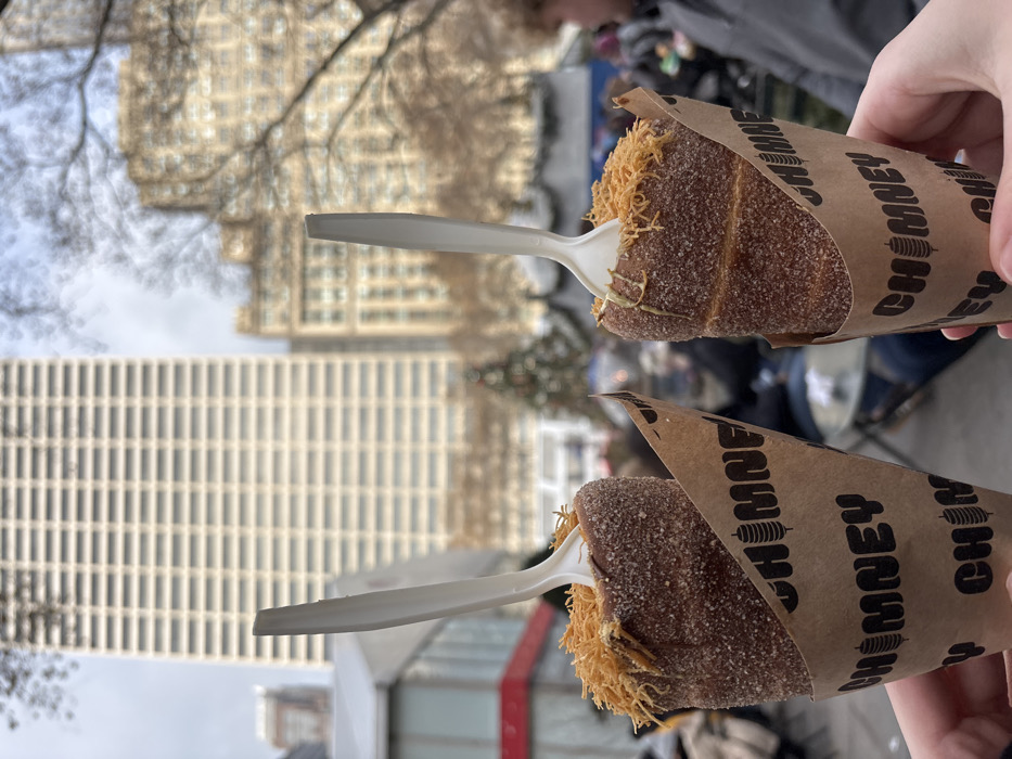 Two "Chimney" pastries are held in hand, each encased in a brown paper cone