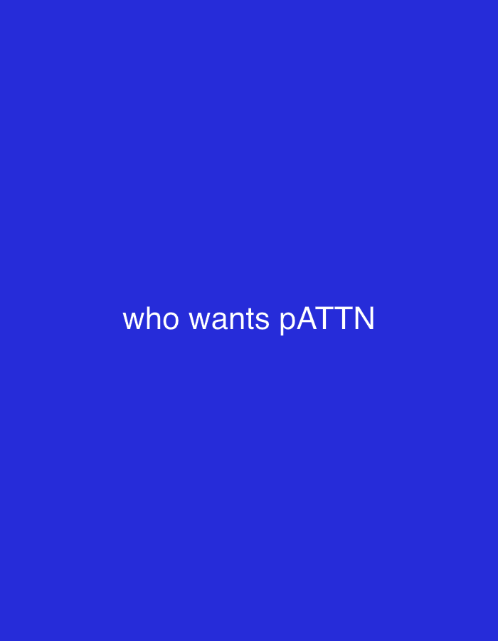 A simple, flat design shows a solid blue background with white text in the center. The text reads "who wants pATTN". The capital letters in "pATTN" draw specific attention. The overall tone is casual and direct, potentially inviting interaction or engagement. The straightforward composition emphasizes the message.