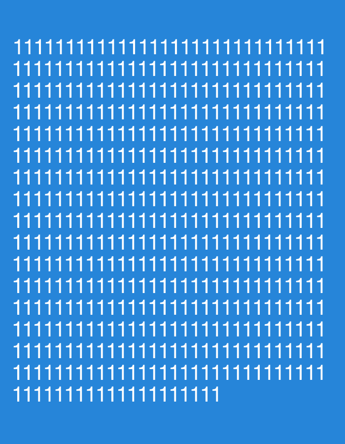 The image displays a uniform blue background. White numeral "1" characters are arranged in a grid-like pattern across the majority of the blue field. There are 13 complete rows, each containing 20 instances of the numeral "1". A 14th row, positioned at the bottom, contains 13 instances of the numeral "1", terminating approximately two-thirds across the image width. The characters maintain a consistent size and font. No identifiable people, subjects, objects, actions, or interactions are depicted. The scene is an abstract digital composition and does not represent a physical environment, rendering any specific geographic location, including Gauting, Germany, inapplicable.