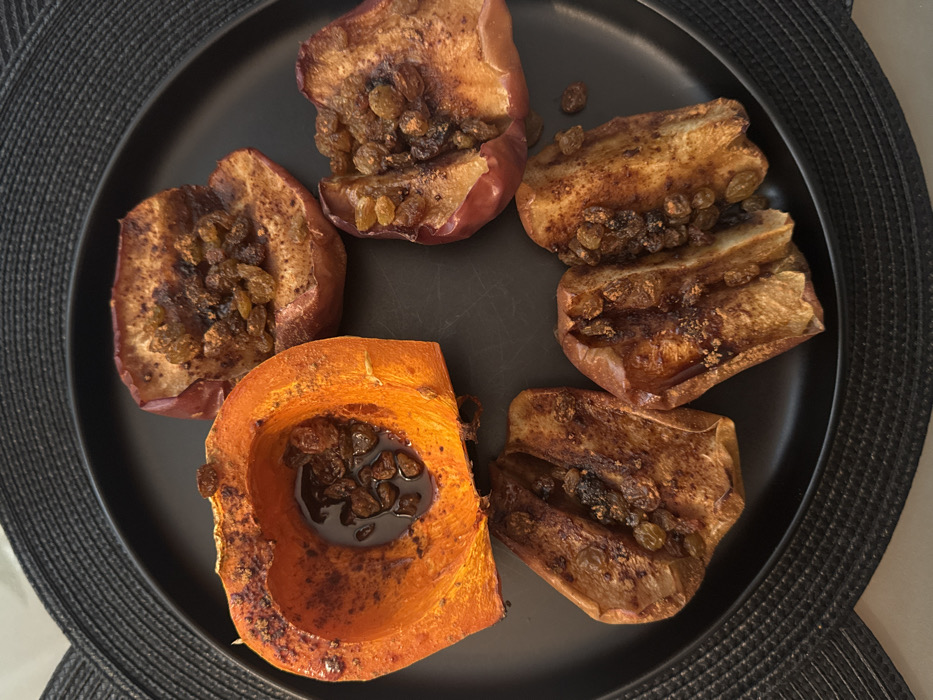 A black, circular plate is centered on a black woven placemat, which rests on a light-colored surface. The plate contains five items of baked fruit: one large segment of baked orange pumpkin and four baked apple halves. The pumpkin segment, positioned at the top-left, is hollowed out and contains a dark viscous liquid with numerous golden raisins. The four apple halves, arranged around the right and bottom portions of the plate, are cored and filled with golden raisins, some appearing caramelized or browned, and exhibit a reddish-brown, wrinkled skin. The scene is located in Sofia, Bulgaria.