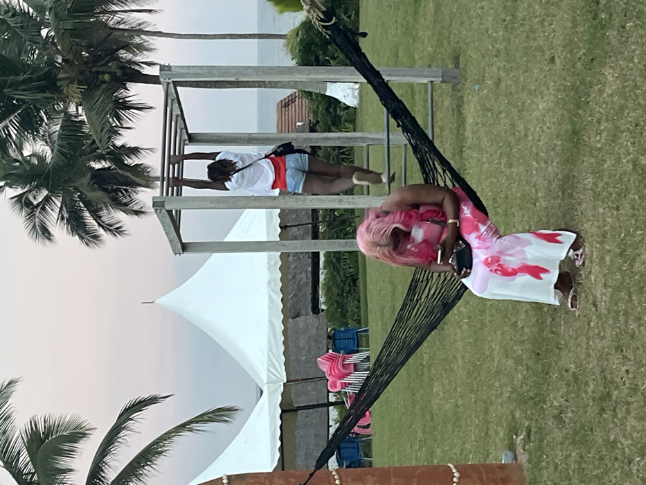 The scene is an outdoor area in Kasoa, Ghana, featuring green grass, multiple palm trees, and the ocean visible in the background. In the foreground, an adult female with long pink hair is seated in a black net hammock. She is wearing a white and pink floral maxi dress and light-colored sandals. Her attention is directed downwards at a smartphone she holds in both hands, with a small black handbag resting on her lap. In the mid-ground, a second adult female with dark hair is hanging from a grey metal monkey bar structure, facing away from the viewer. She is wearing a white button-down shirt over a red top and light blue denim shorts; her bare feet are visible. Behind these individuals, several white, pointed event tents are erected. Stacks of pink and blue chairs are visible near the tents. The distant background reveals the ocean under a light sky, with a partial view of a building featuring a reddish-brown tiled roof.
