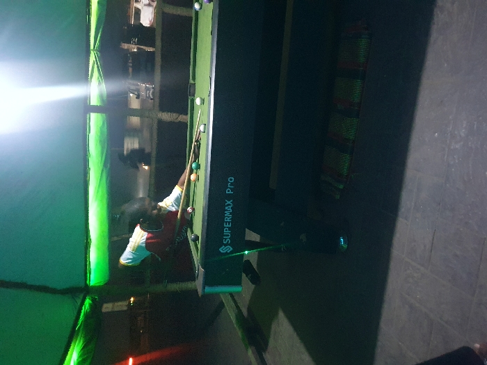 A person in a red and white shirt is playing billiards on a green felt table. The table is labeled "SUPERMAX Pro". There are billiard balls on the table. Bright light shines from the left. A green and red striped object is visible behind the table. The surrounding area appears to be indoors with muted lighting.