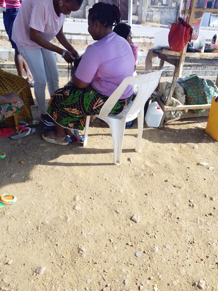 The scene depicts an outdoor hair braiding operation in Lokoja, Nigeria