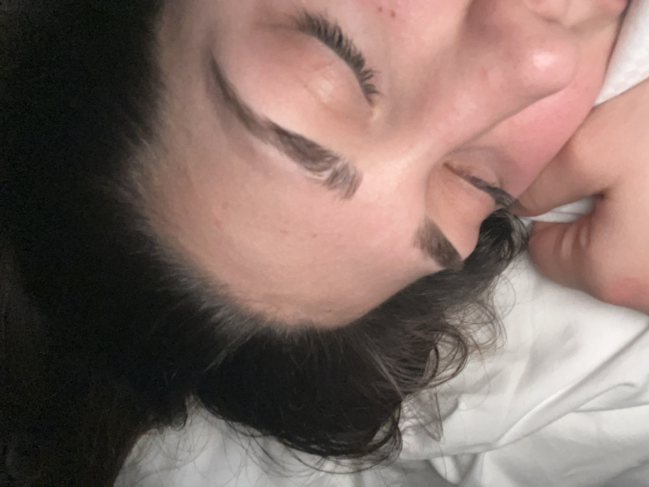A person lies in bed, eyes closed. Dark hair is visible along the forehead and temples, contrasting with the pale skin. The eyebrows are dark and well-defined, complementing the long eyelashes. The nose is prominent, and a hand clutches at a white pillow or sheet. The cheek is slightly flushed. The overall impression is of someone sleeping soundly.