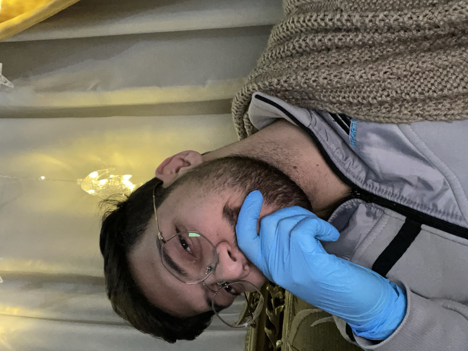 An indoor, close-up portrait in Sarouja Municipality, Syria, features a young adult male with brown hair and a beard, wearing thin, gold-framed glasses. He is looking directly at the camera with a slight smirk. His right hand, clad in a light blue nitrile glove, is raised to his lower face, with fingers partially obscuring his mouth and chin. He is dressed in a light grey zippered jacket with black detailing on the collar and a beige knitted blanket draped over his left shoulder and side. The background consists of light-colored curtains illuminated by warm yellow string lights featuring clear, abstract or star-shaped ornaments. A section of an ornate, possibly gold-colored, furniture armrest is visible on the left side of the frame.