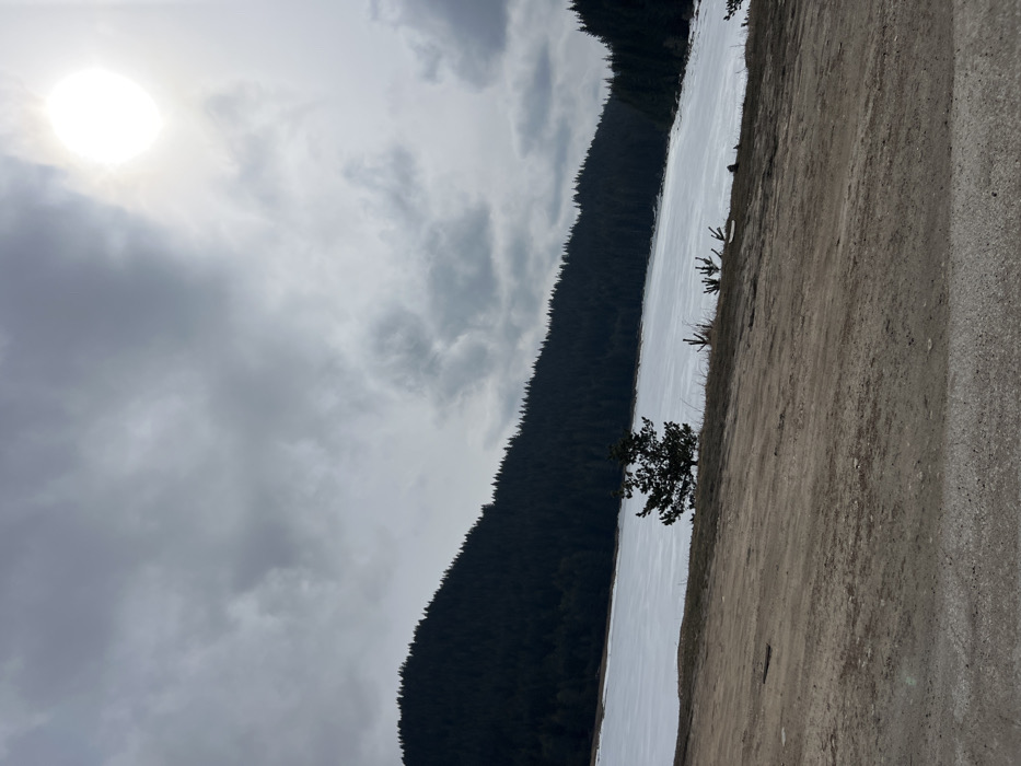 The image displays a winter or early spring landscape near Sarnitsa, Bulgaria. A large, flat body of water, uniformly white and appearing frozen or snow-covered, occupies the middle and right-middle ground. Behind this water, densely forested hills, covered in dark coniferous trees, rise and extend across the scene, appearing darker than the overcast sky. The sky is predominantly cloudy with varying shades of grey, but a bright, circular sun is distinctly visible in the upper right quadrant, casting a strong glare. In the immediate foreground, a barren, brown, sloping dirt or unpaved area leads down towards the water. A single, medium-sized dark conifer tree stands on the bank between the foreground and the frozen water, slightly to the left of the image center, with several smaller saplings visible further right along the same bank. No individuals, animals, or man-made structures are present, and no actions or interactions are depicted.