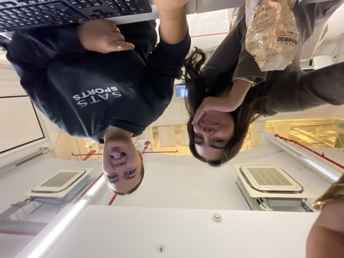 Two young women are visible in an indoor setting, identified as being in Barcelona, Spain. The image is a selfie taken from a low angle, showing the upper bodies of both individuals. The woman on the left, with long dark hair, smiles and rests her chin on her right hand. She wears a dark grey long-sleeved top and holds a crinkled, light-colored bag, possibly a snack package, featuring the text "MIRANDO" and "COME BIEN." The woman on the right, with dark hair pulled back, makes a playful face with her tongue sticking out. She wears a dark hoodie with "SATS SPORTS" printed in white on the front, and her right hand, adorned with rings, rests near a black computer keyboard in the foreground. The background reveals a room with white walls, overhead fluorescent lighting, exposed ceiling utilities including rectangular air conditioning units and red piping, and a white projection screen on the far right. The environment appears to be an institutional or educational setting, such as a classroom or computer lab.