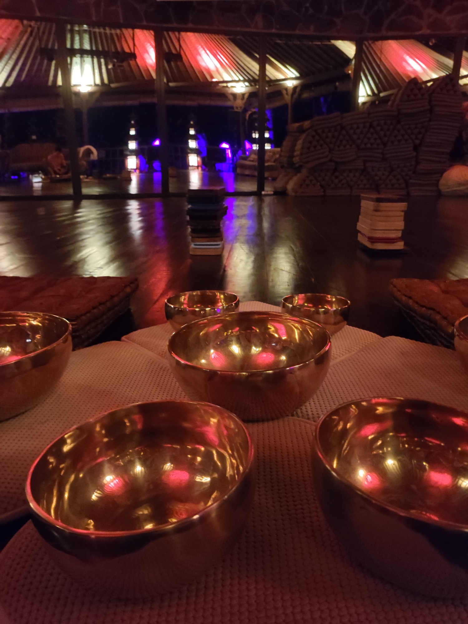 A low-angle shot taken indoors, in Blahbatuh, Indonesia, depicts a circular arrangement of several brass bowls placed on a white, textured surface. The background is blurred, showing a wooden floor reflecting red and blue lights. In the distance, there are elevated seating platforms with thatched roofs supported by wooden pillars. A stack of books is visible near the center of the background. Seated figures can be faintly discerned on one of the platforms.