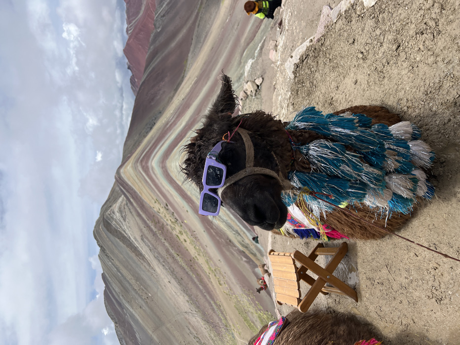 A llama, adorned with blue and silver tinsel, rests with purple sunglasses perched on its face. A small wooden chair sits beside it. The backdrop reveals a striated mountain, exhibiting vibrant layers of red, orange, yellow, brown, and white hues. The sky is overcast with clouds. A person wearing a safety vest is visible in the upper right corner. The scene is captured from a slightly tilted angle.