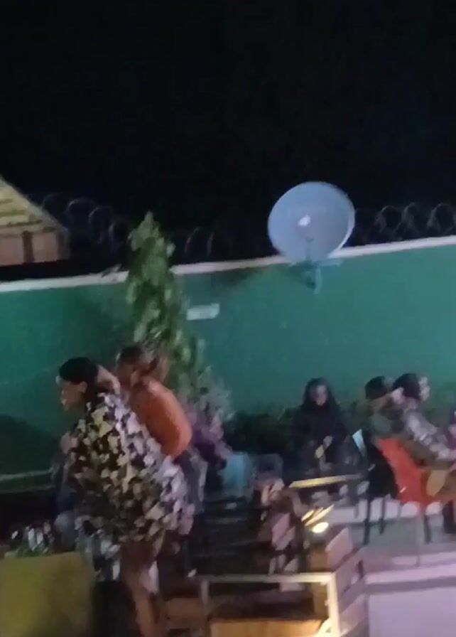 n outdoor nighttime scene that appears to be a bar or restaurant patio. There are several people present, both standing and seated around tables. Some people are dancing. In the background, there's a green wall with LED strip lights that alternate between blue and green. A satellite dish is mounted on the wall. A bar area can be seen indoors with lights on shelves of bottles. The camera moves slightly, focusing on different people and the overall environment.