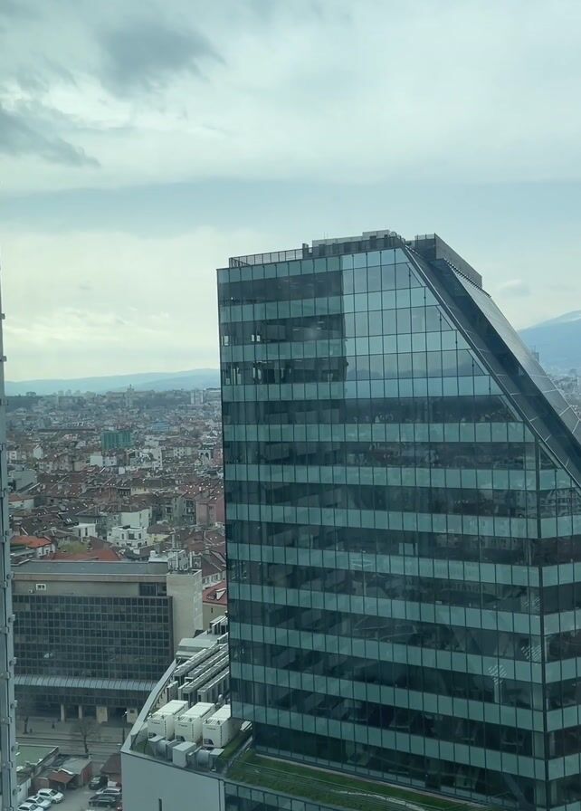 cityscape on a cloudy day, taken from a high vantage point. A modern glass building with a slanted top is prominent in the foreground. Behind the building, the city extends towards a distant mountain range with patches of snow. A wide avenue runs straight through the city center, dotted with cars. The urban landscape consists of various buildings, mostly with light-colored facades and red tile roofs.