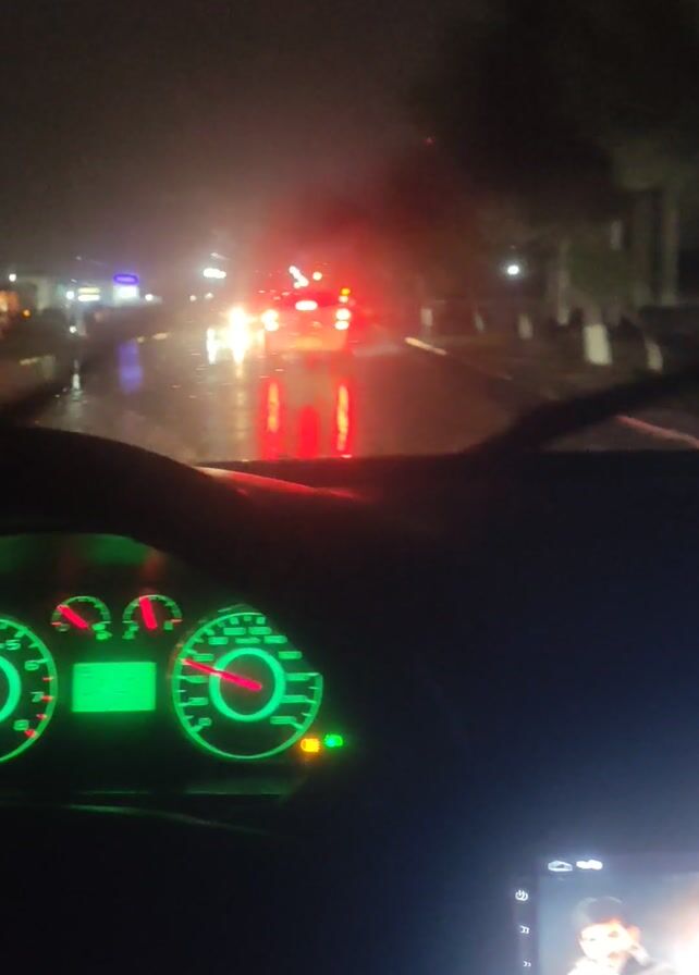 The video is shot from inside a car at night