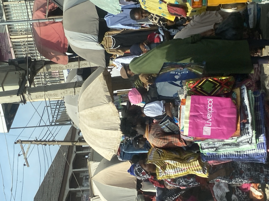 The image portrays an active outdoor market scene in Ado, Nigeria, under daylight conditions