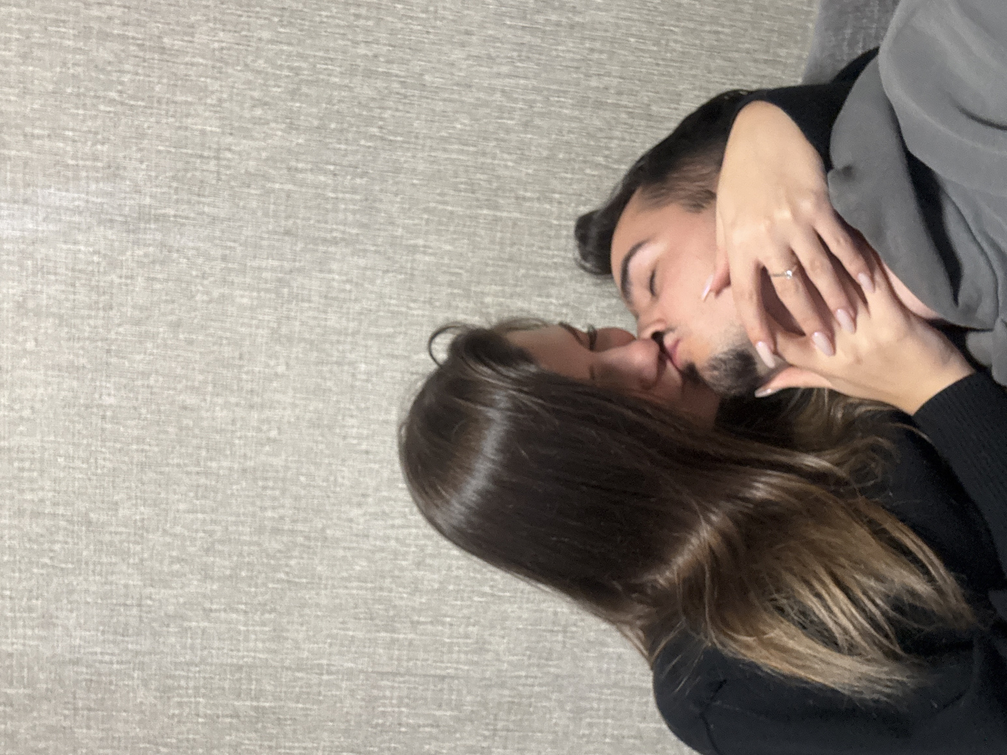 Two individuals, identified as a female and a male, are depicted in a close-up, chest-up shot within an indoor setting. The female, positioned on the left, has long, dark brown hair and is wearing a black long-sleeved garment. She is leaning in to kiss the male, who is positioned on the right and wears a grey hooded garment. The female's left hand is placed on the male's jawline and neck; her fingernails are long, manicured, and light-colored. A ring with a clear, solitary stone is visible on her left ring finger. Both individuals have their eyes closed. The background consists of a light grey, textured wall. A portion of a grey fabric object, possibly upholstery, is visible in the lower right corner, suggesting they are seated or reclining. The specific location within Sofia, Bulgaria, cannot be determined from the visual evidence presented in the image.