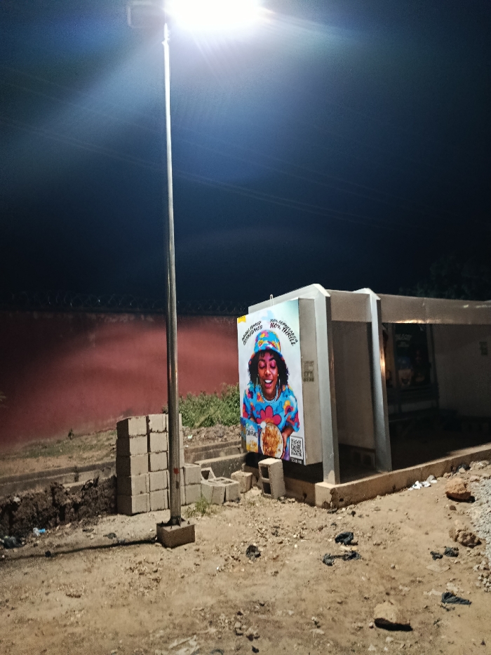 The image depicts an unpaved, dusty ground scene at night in an urban area within Jos, Nigeria. A tall, silver-colored street light pole with an overhead solar panel and bright LED fixture illuminates the foreground from the upper left, casting a prominent lens flare. Beneath the light pole, a stack of approximately 10-12 grey concrete hollow blocks is situated on the left. The ground is uneven, composed of reddish-brown dirt and gravel, with scattered small rocks and several dark pieces of debris (likely plastic bags) visible across the lower half of the frame. To the right, a light-colored, multi-faceted structure, possibly a kiosk or small building, stands on a low concrete curb. Its forward-facing panel displays a large, vibrant advertisement featuring a smiling woman with dark curly hair, wearing a patterned blue, yellow, and red bucket hat and a matching shirt. She holds a plate of food, possibly rice, in her left hand and a beverage in her right. Visible text on the advertisement includes "MAUPEE FLAVORED," "BOURNE MOUTH," "ROXY WHIZZ," and a "SCAN ME" QR code at the bottom. An open section or entrance to the right of the advertisement reveals a darker interior and an additional poster or screen within the structure. In the background, behind the street light and structure, a red-orange wall is visible, topped by a dark security fence, likely razor or barbed wire, stretching horizontally. Patches of green vegetation are discernible between the wall and the structure. No individuals or discernible actions are present in the frame.