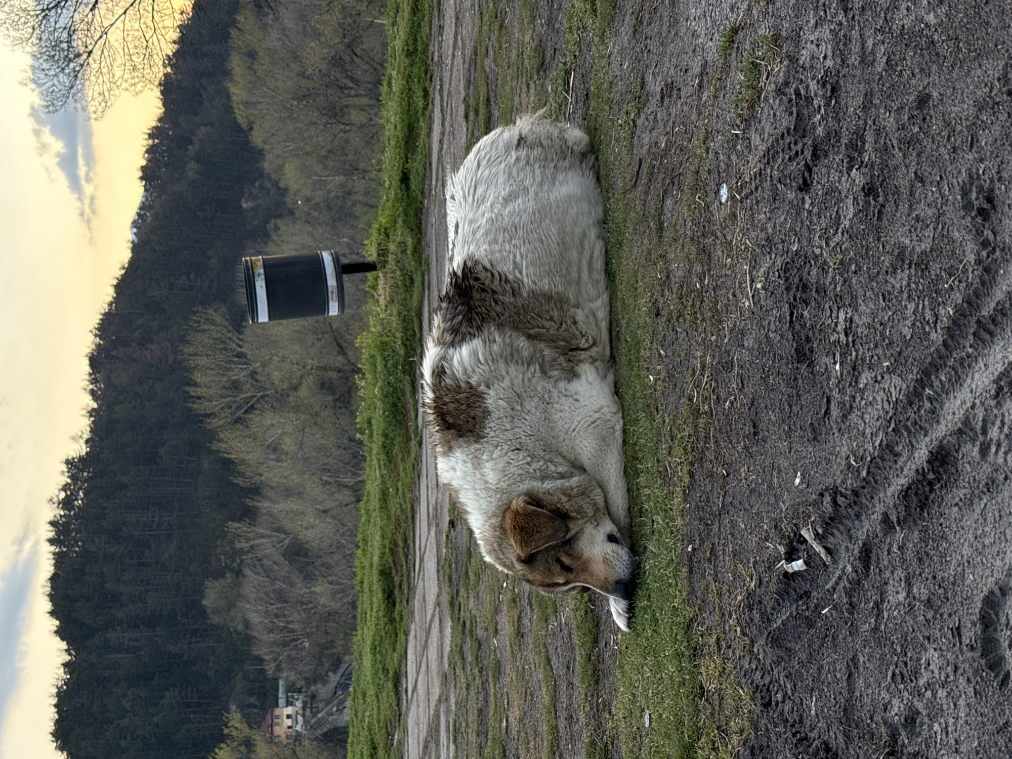 A dog is sleeping on the edge of a paved walkway next to a dirt path. The dog is large, with a light-colored coat and brown patches. A black cylindrical trash can stands next to the walkway. In the background, a mountain rises with trees and a small village. The sky is overcast. The scene appears to be in a park-like setting. The location is possibly German, Bulgaria, based on the context provided.