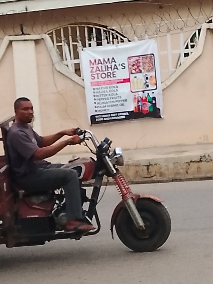 In Lokoja, Nigeria, a single male individual operates a red motorized tricycle on a paved road. The male, with dark skin and short dark hair, wears a dark grey t-shirt and dark trousers, with red sandals visible on his feet. He sits upright, hands gripping the handlebars, and looks forward. The tricycle features a prominent front wheel with a red spring suspension and a headlight. In the background, a light-colored, possibly beige or tan, concrete building is visible. A white banner, advertising "MAMA ZALIHA'S STORE," is affixed to this building. The banner lists products including "NATIVE KOLA," "HAUSA KOLA," "BITTER KOLA," "PEPPER FRUITS," "ALLIGATOR PEPPER," "PALM KERNEL OIL," "HONEY," and states "INCLUDING SOFT DRINKS, ZOOBO AND LOTS MORE." Visual elements on the banner include images of nuts/seeds, bottled liquids, and various soft drinks. The building exhibits a decorative parapet wall and windows with vertical security bars. Barbed wire is installed along the top edge of the building's wall. The road surface is dark grey and appears to be asphalt. The scene is illuminated by natural daylight.