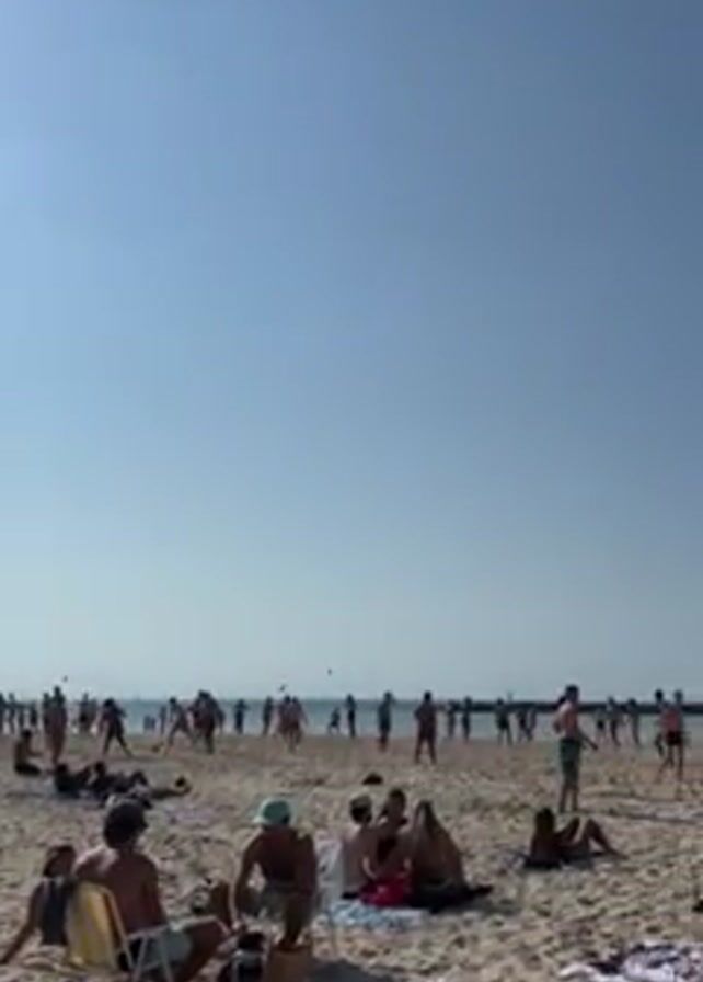 beach scene on a sunny day. There are many people on the beach, some are playing Matkot, a beach paddle game, near the water, while others are sunbathing or relaxing under umbrellas. The beach is sandy, and the sky is clear blue. In the background, there are buildings and a pier. The camera pans across the scene, showing different groups of people and the overall atmosphere of the beach.