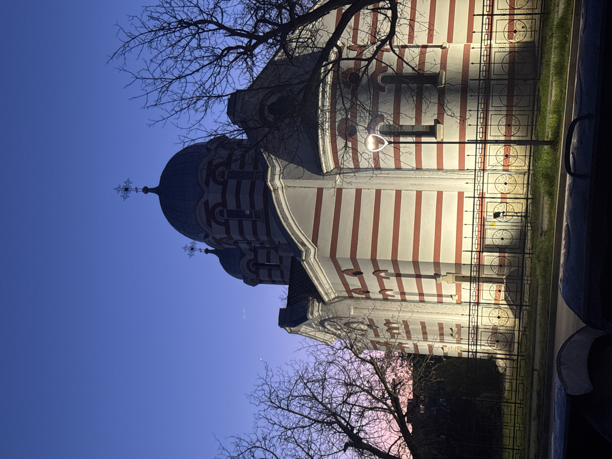 An outdoor, horizontal shot reveals a building in Kozloduy, Bulgaria, notable for its domes and striped exterior. The building is surrounded by bare trees, partially obscuring the view, and a decorative fence. A lamp post provides illumination. The sky transitions from a deep blue to a lighter hue, suggesting either dawn or dusk. The entire composition is slightly rotated counterclockwise.