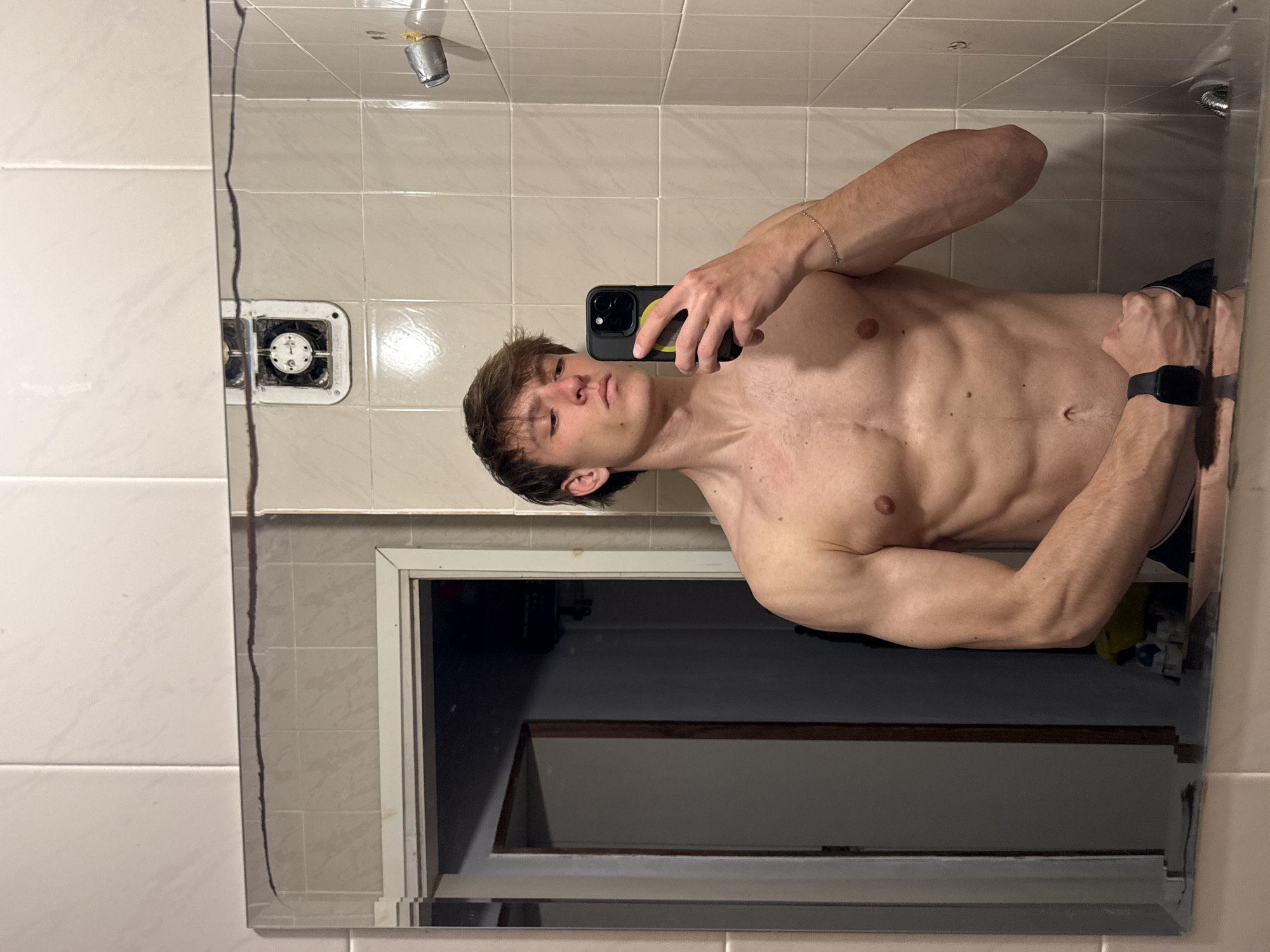 A shirtless young man with brown hair is taking a selfie in a bathroom mirror. He is flexing his right arm, and a smartwatch is visible on his left wrist. He's holding a black smartphone with a yellow sticker on it. The bathroom has beige tile walls. A showerhead and a ventilation fan are visible on the upper part of the wall reflected in the mirror. A dark doorway is seen reflected in the lower part of the mirror. There is no information to determine if this is in Sofia, Bulgaria.