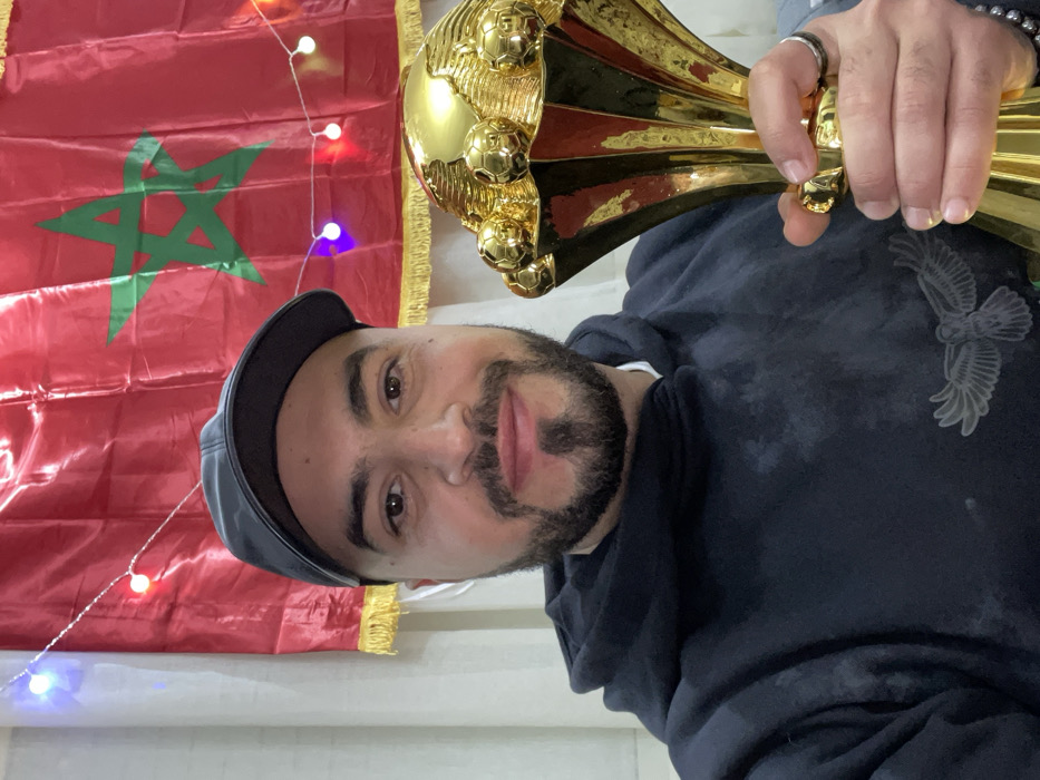A man holds a large gold trophy decorated with soccer balls. He's wearing a black hat and hoodie with an eagle graphic. Behind him is a Moroccan flag adorned with string lights. The man has a beard and a ring on his finger. The scene appears to be indoors.